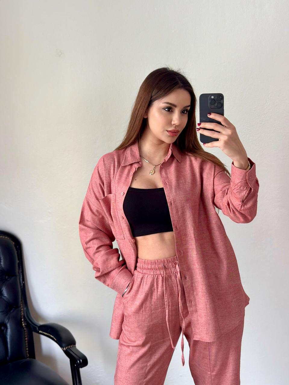 Gömlek ise yine yüksek kaliteli keten kumaştan üretilmiştir ve üstün konfor sunar. Geniş ve ferah bir kesime sahip olmasının yanı sıra, kadın bedenine özel tasarımı ile mükemmel bir uyum sağlar. Gömleğin yaka kısmı şık bir detay olarak düğme detayı ile tamamlanmıştır.