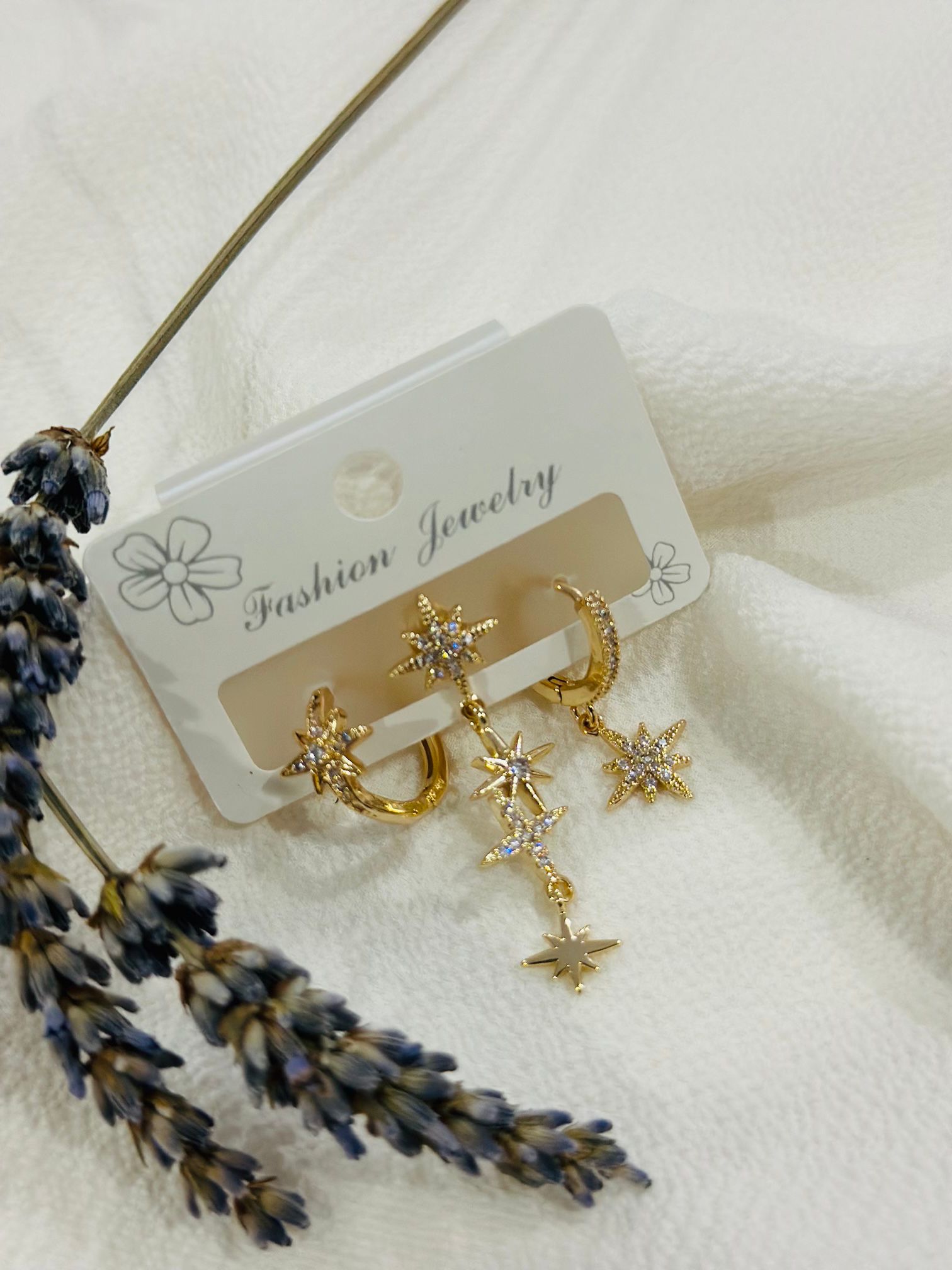 Setin özelliği, farklı boyutlardaki üç küpenin bir arada sunulmasıdır. Böylelikle istediğiniz gibi küpelerinizi değiştirerek farklı tarzlara uyum sağlayabilirsiniz. Küpelerin pirinç malzeme üzerine parlak gold renk kaplaması, her birine zengin bir görünüm kazandırır. Ayrıca yıldızların detaylı işçiliği, bu küpeleri olmazsa olmaz bir aksesuar haline getirir.
